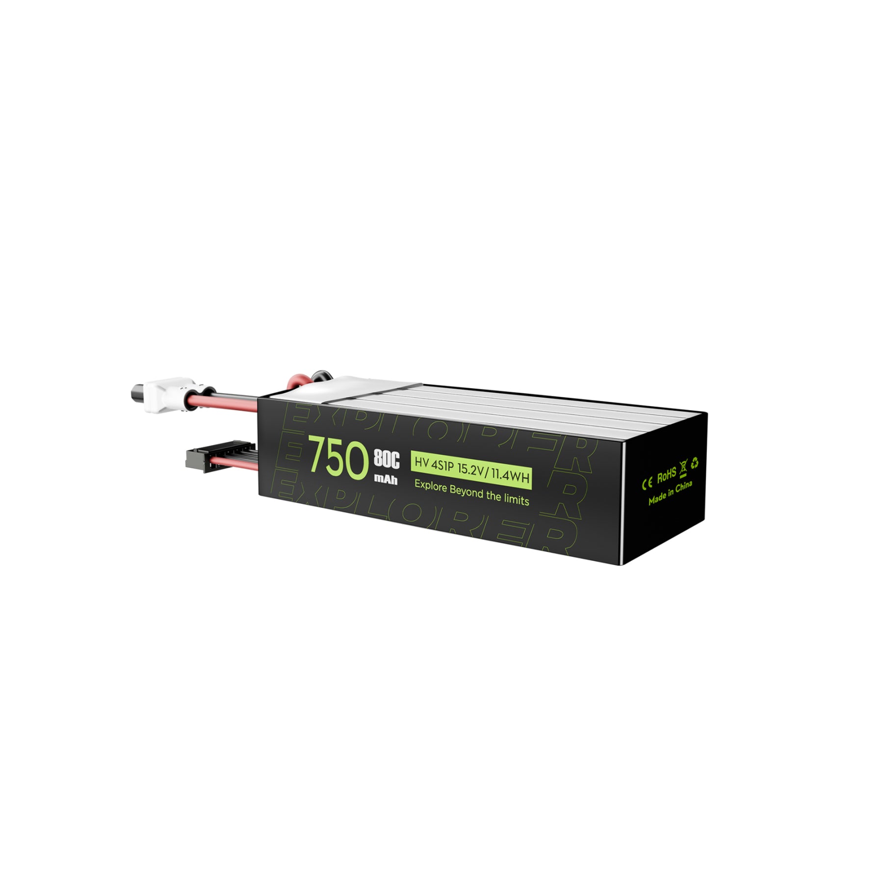 Battery FLYWOO Explorer 750mAh 4S HV 75C LiPo (2 pcs) The FLYWOO Explorer 750mAh 4S HV 80C LiPo Battery is optimized for long-range micro quadcopters, offering longer flight time and more consistent power delivery. It is made of high-voltage cells (15.2 V) and provides higher energy density without increasing weight. This version is equipped with the improved XT30UP connector, which was designed by FLYWOO to eliminate wiring malfunctions and ensure a smoother connection. The compact design and low weight (only 66.9g) make it ideal for use in compact structures, while the 80C discharge current ensures high performance during demanding manoeuvres. Packed in a set of two, this battery is ideal for pilots who push the limits of endurance and agility. Specifications: Minimum capacity: 750 mAh Configuration: 4S1P / 15.2 V / 4 cells Discharge current: 80C Weight: 66.9g (each) Dimensions: 70 x 30 x 17.5 mm Discharge connector: XT30UP Charging connector: JST-XHP-5P Wire gauge: 16AWG silicone wire The package contains: 2 x FLYWOO Explorer 750mAh 4S HV 75C LiPo batteries