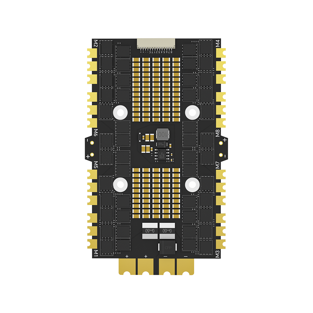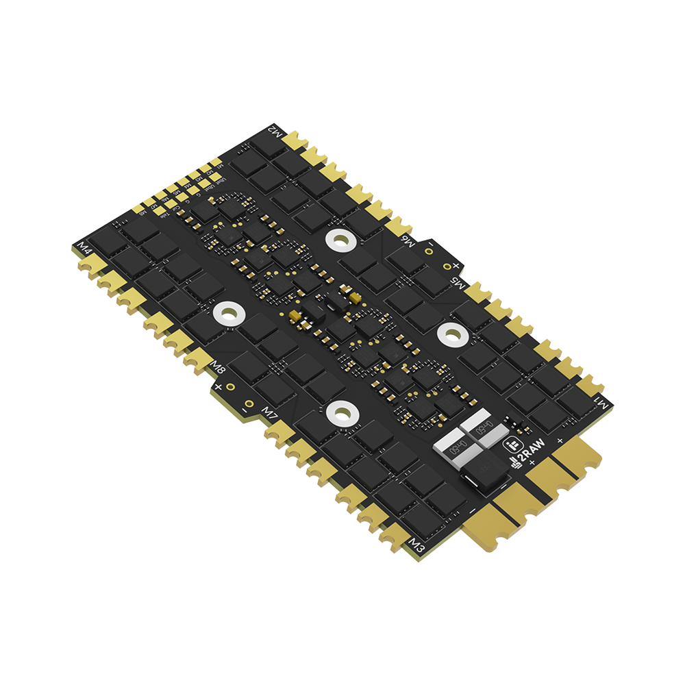 ESC iFlight Thunder 80A 8-in-1 The 8v1 8s ESC is carefully designed for drones with 8-motor (x8) configuration, emphasizing high-end electrical performance. This ESC offers an impressive amount of ceramic capacitors on the board, complete with two dedicated slots for external 50V capacitors. It has enlarged soldering surfaces for easy connection and at the same time ensures excellent contact. The PCB is reinforced and designed with larger-than-standard traces for better conductivity, which promotes smooth performance. Additionally, the 8v1 connector supports a direct plug-and-play connection to the 2RAW H7 FC, although options for solder pads are also available. With 2-8s power supply support, this ESC is an excellent choice for almost any high-performance x8 cinelifter setup, featuring exceptional components. Specifications: Input voltage: 2-8S Max. continuous current: 80A Max. burst current: 100A MCU: G071 BEC: No Firmware: Blheli_32 32.9 Current sensor: Yes Current measurement: 250 Telemetry: Supported Target: IFLIGHT_BLITZ_G2 Mounting dimensions: 30.5 × 30.5 mm, φ4 Dimensions: 100 × 60.5 mm ±1 Weight: 61g ±1 Protocol: Support DShot 150/300/600, MultiShot, OneShot, etc. The package contains: 1 × 2RAW Thunder 8-in-1 8S ESC (G2) 1 × Wiring Kit