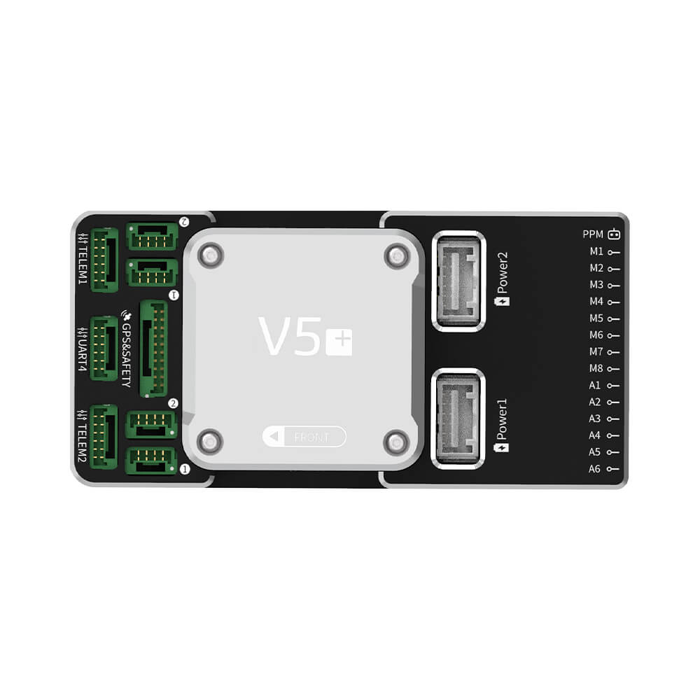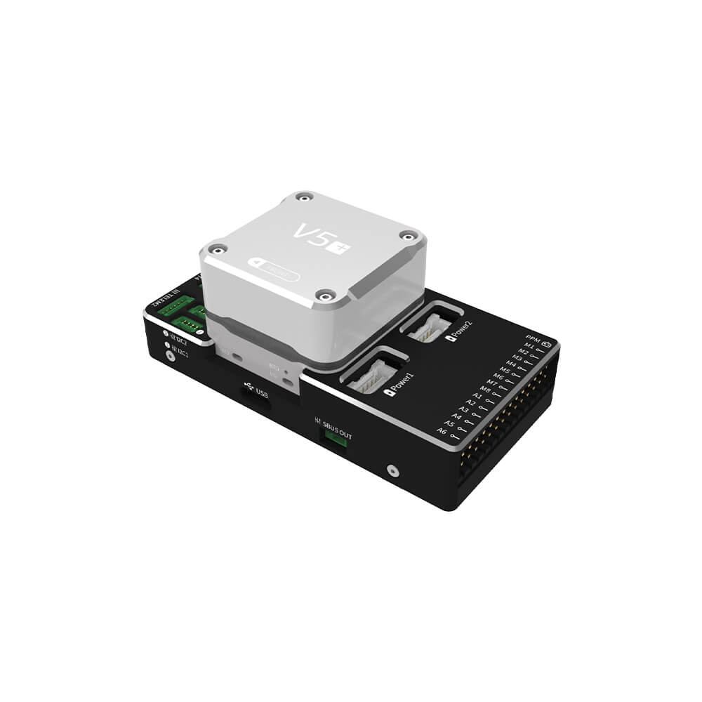 Flight controller CUAV V5+ The CUAV V5+ is a professional-grade flight controller featuring a powerful dual-processor design: a 216 MHz STM32F765 Cortex-M7 for primary flight tasks and a dedicated 24 MHz STM32F100 Cortex-M3 for I/O handling. It integrates triple redundant IMUs (ICM-20602, ICM-20689, BMI055), an IST8310 magnetometer, and an MS5611 barometer for rock-solid stability and precision. With 14 PWM outputs, dual CAN, SBUS, PPM/DSM inputs, multiple UARTs, I²C, SPI, and a safety-enabled GPS interface, the V5+ supports complex VTOL and multicopter configurations. Rated for 4.5–36 V servo rail and –20 °C to +85 °C operation, it’s ideal for industrial, surveying, and professional aerial platforms. Specifications: Main MCU: STM32F765, 216 MHz, 2 MB Flash, 512 KB RAM I/O MCU: STM32F100, 24 MHz, 8 KB SRAM IMUs: ICM-20602 + ICM-20689 + BMI055 (Accel & Gyro redundancy) Magnetometer: IST8310 Barometer: MS5611 Operating Voltage: 4.5–5.5 V USB Power Input: 4.75–5.25 V Servo Rail Input: 0–36 V Environment: –20 °C to +85 °C Size & Weight: 85.5 × 42 × 33 mm, 91 g Interfaces: PWM outputs ×14 (6 configurable as GPIO) SBUS out ×1; PPM in ×1; DSM/PPM/RC SPort/ RSSI ×1 ADC ×1 (3.3 V/6.6 V) Telemetry UARTs ×2; Serial UART ×1 CAN buses ×2 SPI ×1; I²C buses ×4 GPS interface with safety switch & buzzer (I²C) ×1 USB Type-C ×1; Debug port ×1; TF (microSD) slot ×1 Package Includes: 1 × CUAV V5+ Flight Controller 1 × USB-C Configuration Cable 4 × Anti-vibration Mounts 4 × M3 Mounting Screws & Nuts 1 × Quick-Start Guide 1 × Safety-Switch Jumpers Kit