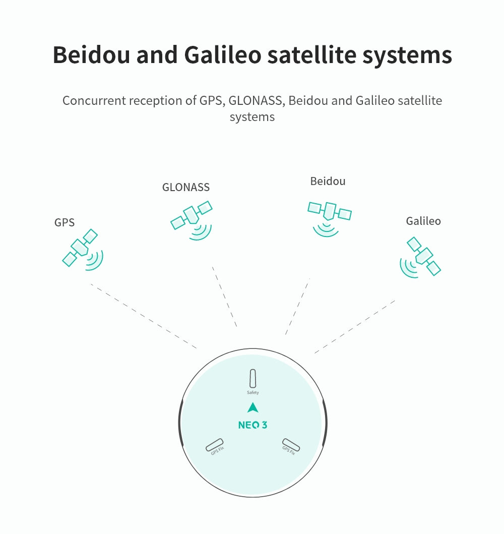NEO continues the NEO V2 hardware design, with an upgrade of the GNSS module to the Ublox NEO M9N. It supports simultaneous reception of Beidou, Galileo, GLONASS and GPS, with a horizontal positioning accuracy of up to 0.7m. It has an integrated safety switch, buzzer and RGB indicator.