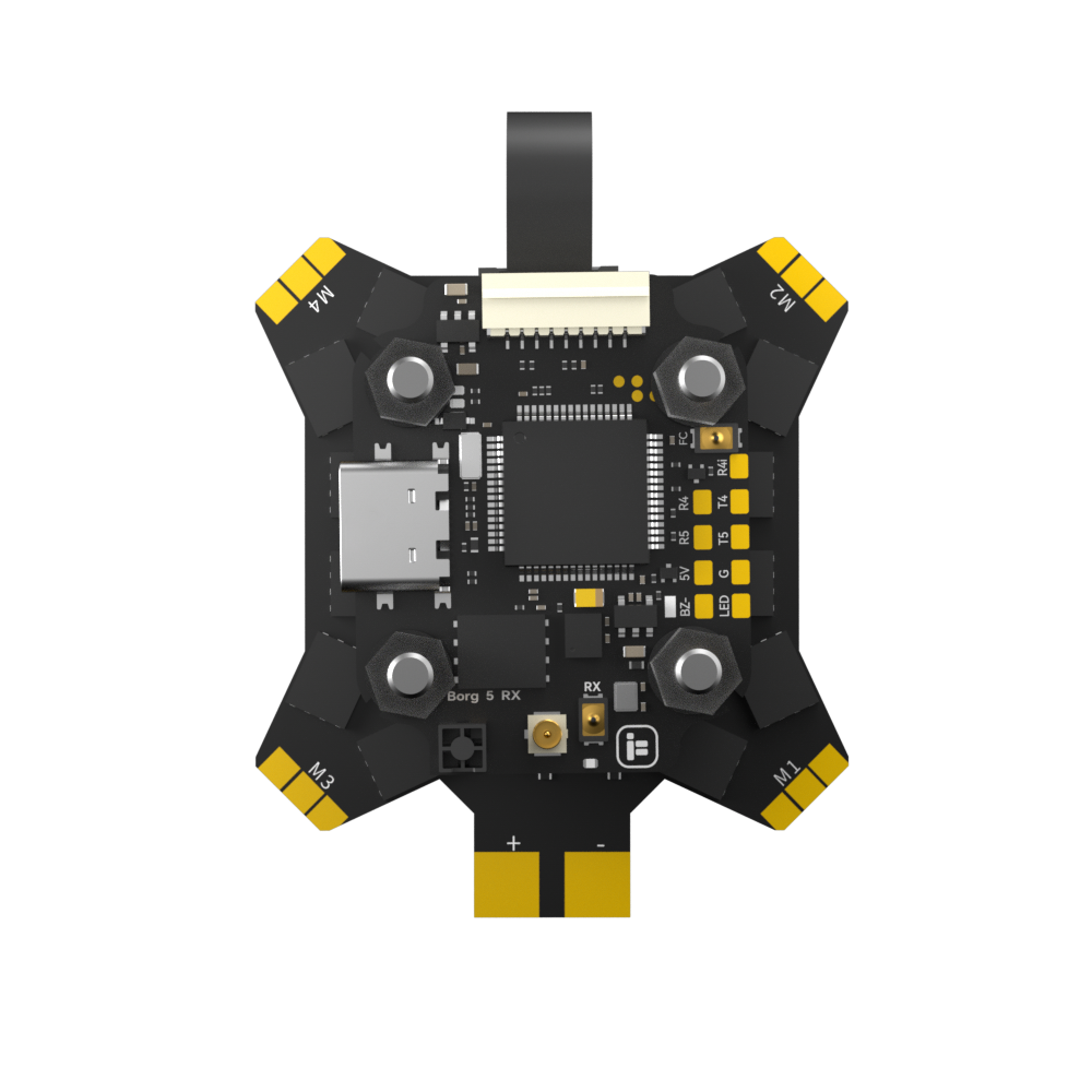 Stack iFlight Borg 5S RX Stack (Borg 60R ESC) The iFlight Borg 5S RX Stack is a powerful all-in-one racing stack designed for high-speed FPV performance. This system features a flight controller with an integrated 2.4 GHz ExpressLRS (ELRS) receiver and integrated antenna, ensuring ultra-reliable signal quality. The Borg 5S RX FC supports 4-8S input voltage and allows external receivers for custom setups. The included Borg 60R ESC delivers up to 60A continuous current and supports DShot and telemetry. Equipped with modern components such as the AT32F435 MCU, ICM42688 gyro, and robust 12V/5V BECs, this stack is optimized for low latency, minimal noise, and serious racing requirements. FC Specifications: Input Voltage: 4-8S; Supports LIHV battery MCU: AT32F435RGT7 Gyro: ICM42688 Barometer: Not included OSD chip: AT7456E Flash: 16MB (Blackbox Flash) UARTs: 4 Motor outputs: 4 I2C serial: Not supported VTX protocol: Supports DJI MSP/Smartaudio/IRCTramp/HDZero LED controller: Yes Beeper pad: Yes Firmware target: IFLIGHT_BLITZ_ATF435 (Betaflight) Mounting pattern: 20×20 mm, Φ4 mm Dimensions: 34×27 mm ±1 Weight: 6.8 g ±1 BEC: 5V 2.5A, 12V 2A (12V with VTX switch) ESC Specifications: Product Name: Borg 60R ESC Input Voltage: 3-8S; Supports LIHV batteries Max. continuous current: 60A Max. peak current: 65A (10s) MCU: STM32G071N Driver: FD6288 Firmware: BL32 (32-bit ESC) Target: IFLIGHT_BLITZ_G3 32.9 Current sensor: Not available BEC: Not available Telemetry: Supported Bidirectional DSHOT: Supported Dimensions: 45×52 mm ±1 Mounting holes: 20×20 mm / Φ4 mm Weight: 14.5 g ±1 Protocol: Supports DShot150/300/600, MultiShot, OneShot, etc. Package includes: 1 × Borg 60R ESC 1 × Borg 5S RX Flight Controller 1 × Cable set 5 × silicone grommets